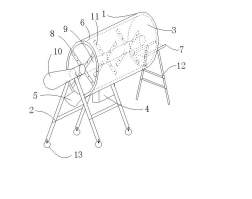 滾筒篩內(nèi)設(shè)置有攪 拌架,攪拌架被支撐架支撐,攪拌架通過攪拌軸與土壤箱外的電機(jī) 相連接。 攪拌架上設(shè)置有多 個(gè)碎土的帶狀凸起。 入料口處,土壤箱 上設(shè)置有一可用于送料的梯子,梯子與土壤箱活動(dòng)連接。