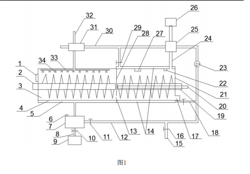 多功能土壤修復(fù)設(shè)備,包括修復(fù)箱,修復(fù)箱內(nèi)設(shè)有隔板,隔板將修復(fù)箱分割成噴淋修 復(fù)室和熱解吸修復(fù)室,修復(fù)箱兩側(cè)的側(cè)壁上分別設(shè)有進料口和出料口,噴淋修復(fù)室內(nèi) 設(shè)有第一螺旋輸送機,熱解吸修復(fù)室內(nèi)設(shè)有第二螺旋輸送機,隔板下端設(shè)有通孔;噴 淋修復(fù)室內(nèi)設(shè)有噴淋裝置,噴淋裝置連接有淋洗劑進管,噴淋修復(fù)室的底部為濾網(wǎng), 濾網(wǎng)下方設(shè)有集液腔;熱解吸修復(fù)室內(nèi)設(shè)有土壤加熱裝置,頂部連接有廢氣管道;廢 氣管道上設(shè)有第一換熱器,淋洗劑進管上設(shè)有第二換熱器,集液腔通過淋洗劑冷管與 第一換熱器的入口連接,第一換熱器的出口通過淋洗劑熱管與第二換熱器的入口連接 。本設(shè)備可同時去除土壤中的化學(xué)污染物和有機污染物,并且廢氣熱量可回收利用。