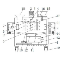 土壤修復(fù)釜,包括箱體,箱體的頂部固定連接有電機(jī)箱,且電機(jī)箱的頂部固定連接有第一電機(jī),第一電機(jī)的輸出軸通過聯(lián)軸器固定連接有旋轉(zhuǎn)軸,旋轉(zhuǎn)軸的底端依次貫穿電機(jī)箱的底部和箱體的頂部且延伸至箱體的內(nèi)部,旋轉(zhuǎn)軸位于箱體內(nèi)部的一端固定連接有螺旋桿,旋轉(zhuǎn)軸位于箱體內(nèi)部的表面固定連接有主動齒輪,本發(fā)明涉及