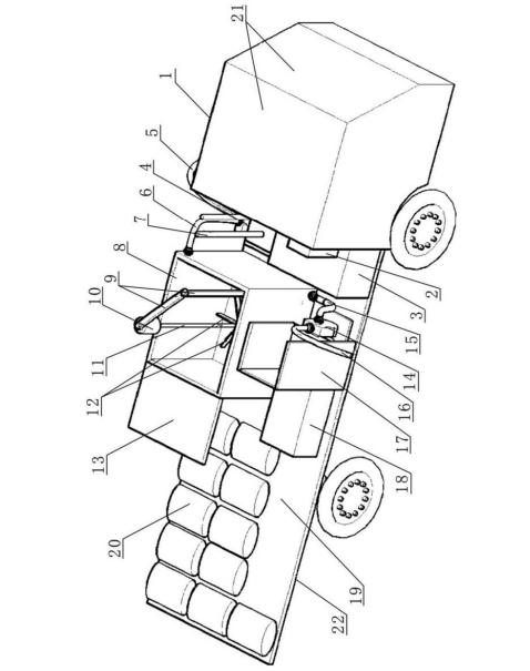 車載自吸水式農(nóng)田土壤修復(fù)設(shè)備劑施撒,包括車載移動(dòng)平臺(tái),車載移動(dòng)平臺(tái)包括車頭和車廂,車廂的車廂頭部上設(shè)有發(fā)電機(jī)組、攪拌箱、吸水泵、進(jìn)料平臺(tái)、噴施泵和人工站臺(tái),車頭設(shè)有與發(fā)電機(jī)組電連接的控制箱,吸水泵的進(jìn)水口密閉連接有吸水管,吸水泵的出水口密閉連接有上水管;攪拌箱與上水管相連通,攪拌箱頂部設(shè)有攪拌電機(jī),攪拌箱的箱內(nèi)豎直設(shè)有輥軸,輥軸上設(shè)有攪拌葉輪;噴施泵的進(jìn)水口密閉連接有出水管,噴施泵的出水口密閉連接有噴施管,人工站臺(tái)靠近噴施泵設(shè)置;吸水泵、攪拌電機(jī)、噴施泵分別與控制箱電連接;車廂的車廂尾部具有修復(fù)劑堆放區(qū)。本發(fā)明具有可自吸水、無(wú)粉塵污染、靈活高效、無(wú)破壞性等優(yōu)點(diǎn)。
