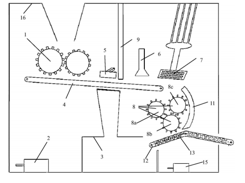 在污染土壤的修復(fù)過程中,最要的部分是將挖出的污染土壤進(jìn)行土壤破碎成小顆粒 狀,并與修復(fù)藥水進(jìn)行充分的接觸達(dá)到修復(fù)的目的。目前,土壤破碎很多并不充分,存在 大量塊狀土壤及碎石,不能達(dá)到充分修復(fù)的目的。為了克服現(xiàn)有技術(shù)中存在的不足,本實(shí)用新型提供一種用于土壤破碎 及修復(fù)的機(jī)械裝置,內(nèi)部設(shè)置了多個破碎裝置、噴霧裝置和篩選裝置,可以有效的對土壤進(jìn)行破碎和修復(fù),同時剔除大塊碎石,減少對機(jī)器的損耗,同時保證更好的已修復(fù)土壤。