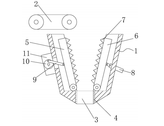 固廢土壤破碎設(shè)備,主要包括裝置外殼、進(jìn)料機(jī)構(gòu),所述進(jìn)料機(jī)構(gòu)位于裝置外殼上方,所述裝置外殼底部設(shè)置有排料孔,所述排料孔側(cè)壁上設(shè)置有耐磨層,所述裝置外殼內(nèi)部一側(cè)設(shè)置有破碎板A,另一側(cè)設(shè)置有破碎板B,所述破碎板B與調(diào)節(jié)桿連接,所述破碎板A、破碎板B側(cè)壁上設(shè)置有破碎齒,所述破碎板A與連接桿連接,所述連接桿與偏心輪連接,所述偏心輪與驅(qū)動電機(jī)連接。本發(fā)明結(jié)構(gòu)簡單,在使用時(shí)調(diào)節(jié)桿控制破碎板B的張角角度調(diào)節(jié),同時(shí)驅(qū)動電機(jī)帶動連接桿往復(fù)移動實(shí)現(xiàn)破碎板A可以對固廢進(jìn)行粉碎,這樣使垃圾得到充分粉碎,且避免了發(fā)生堵塞現(xiàn)象,有效的提高了垃圾的粉碎效率。