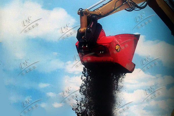 土壤破碎篩分鏟斗通常安裝于通用工程機(jī)械如挖掘機(jī),裝載機(jī)之上,工作時采用主機(jī)本機(jī)動力,主機(jī)駕駛員在駕駛室內(nèi)通過腳踏閥對鏟斗內(nèi)的篩分破碎滾軸實施操控。鏟斗的核心特點是在旋轉(zhuǎn)刀板的上部設(shè)計有一個單獨的格柵裝置,工作時刀板在格柵間的縫隙里不斷地梳理材料,材料通過格柵之間的縫隙落下,刪條間距決定了最終篩下物料的大小,從而實現(xiàn)了篩分,破碎,混合,曝氣等多種作功能。駕駛員在主機(jī)駕駛室內(nèi)一步操作即可完成,頂部格柵篩分結(jié)構(gòu)設(shè)計使破碎篩分作業(yè)更加流暢,甚至可以處理濕性物料。