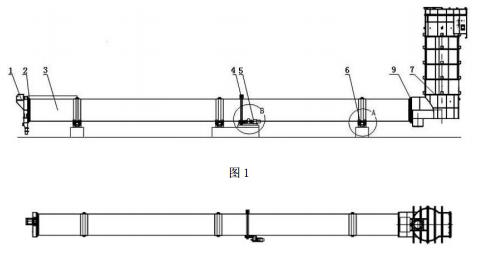 土壤熱脫附設(shè)備包括筒體,所述筒體沿其中軸線方向傾斜地安裝在數(shù)對托輪上,筒體低端口處設(shè)有口護(hù)板并形成套筒空間,筒體通過套筒空間連接燃燒室,所述燃燒室與筒體之間設(shè)有尾部密封裝置,沿所述筒體長度方向上套接數(shù)個(gè)矩形輪帶,所述矩形輪帶連接下方的支承裝置,所述筒體高端口處設(shè)有進(jìn)料罩,所述進(jìn)料罩與筒體之間設(shè)置有頭部密封裝置,在所述筒體中后部固定有用于傳遞轉(zhuǎn)矩大齒圈,所述大齒圈通過節(jié)向彈簧板與筒體懸掛聯(lián)接,所述筒體中部設(shè)置有傳動裝置,所述傳動裝置由電動機(jī)、連接電動機(jī)的減速器、以及通過聯(lián)軸器連接減速器輸出軸的小齒輪組成,所述小齒輪與大齒圈嚙合傳動。